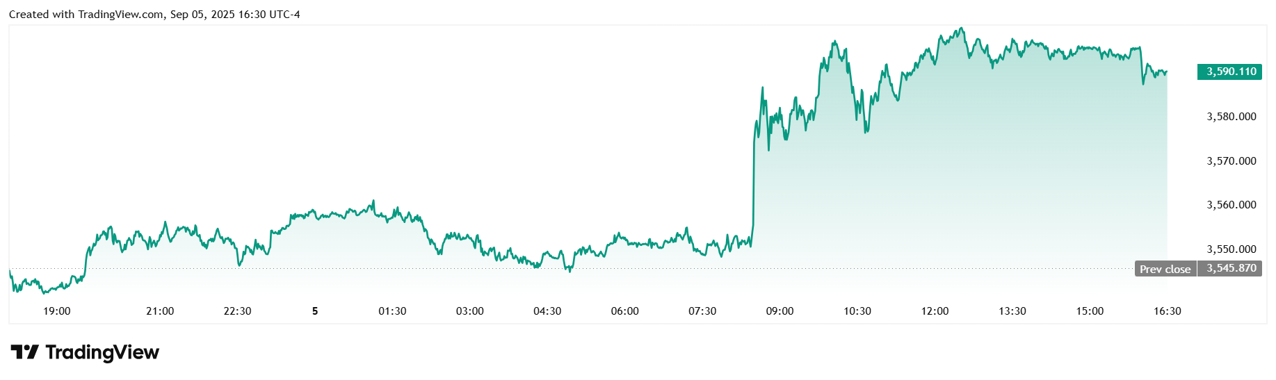 Vào ngày 5 tháng 9 năm 2025, vàng chính thức vượt ngưỡng 3.600 USD/oz, đánh dấu một tuần tăng giá mạnh nhất trong thời gian dài. Điều này được thúc đẩy bởi sự kết hợp của yếu tố kỹ thuật, các dữ liệu cơ bản, cũng như dòng tiền bắt đầu “chảy vào” vì kỳ vọng lạm phát và chính sách tiền tệ nới lỏng.